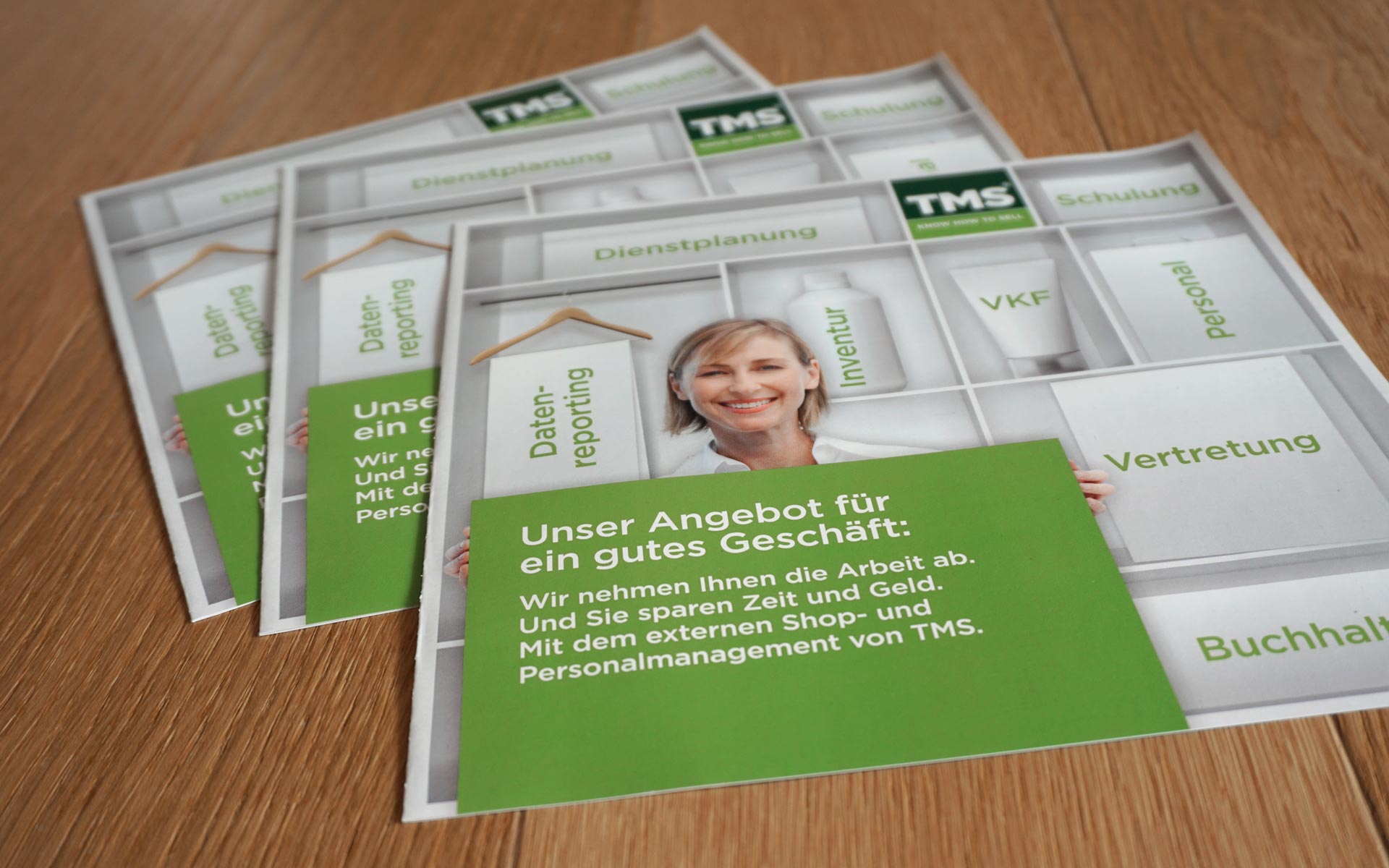 Die Vertriebsagentur TMS übernimmt für etablierte Markenartikel das komplette Shopmanagement vor Ort. Das von uns gestaltete Mailing verdeutlicht, welche Vorteile das für die Auftraggeber hat. Weiterhin entwickeln wir Plakate und Dekoartikel für diverse Firmenevents. Um die Vertriebsteams im täglichen Einsatz zu unterstützen, haben wir gemeinsam mit den Kunden eine spezielle eLearning-Oberfläche entwickelt. Hier werden interne Abläufe und Kalender ebenso aktuell wie übersichtlich veröffentlicht. Content Management System: Typo3.